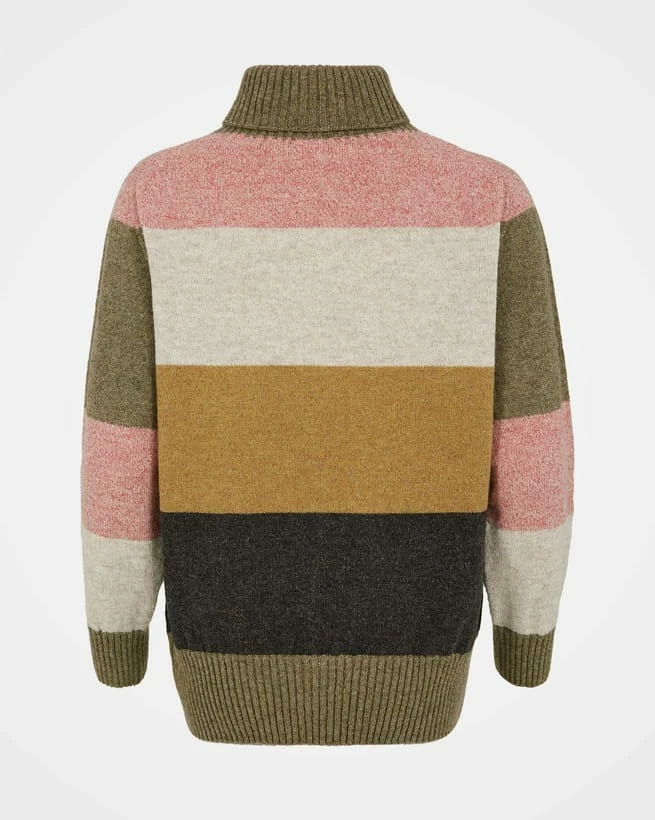 Bringing together our new-season colour palette in a contemporary block stripe, this roll-neck sweater is knitted in a cosy Shetland-style yarn that has a delightfully rustic handle. Dropped shoulders and a seamless construction create a laid-back silhouette with an unrestricted feel, while ribbing at the collar, cuffs and hem frames the chunky stripe. The length of this style is perfect for teaming with your skinny jeans and leggings.