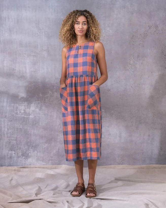 This sleeveless midi dress is made from a mid-weight, woven fabric. The large scale gingham print is bright and summery. The skirt is gathered at the waist seam to provide a full, drapey appearance, and has large patch pockets that are cut on the bias, adding nice detail. The crew neckline features a keyhole detail with two coconut buttons and loop fastenings.