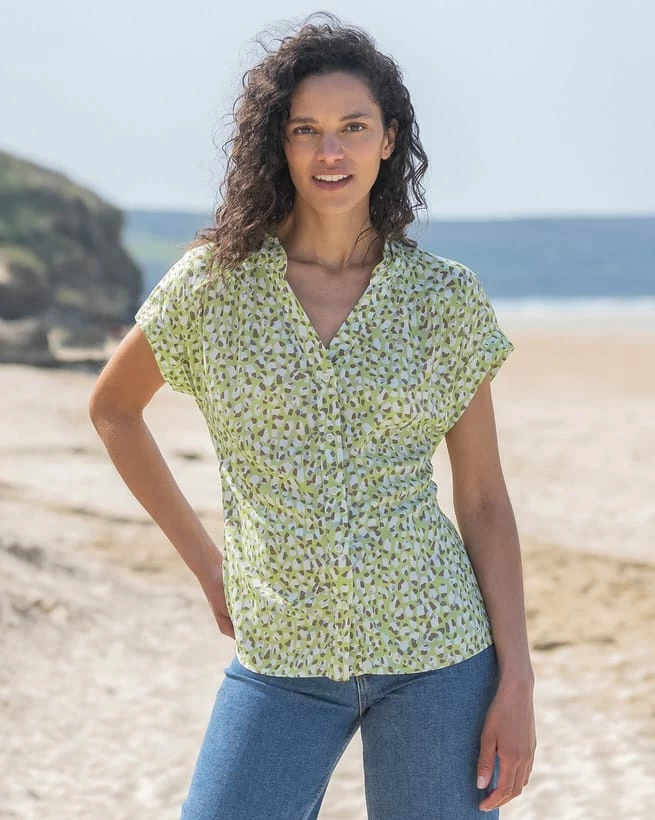 Made in a beautifully soft, flowing fabric, this Corozo-button through blouse features a small stand collar and grown on shirt sleeves with turn back cuffs. The back of the shirt flatteringly curves down for additional length, and there is soft gathering into the front and back yoke seams.