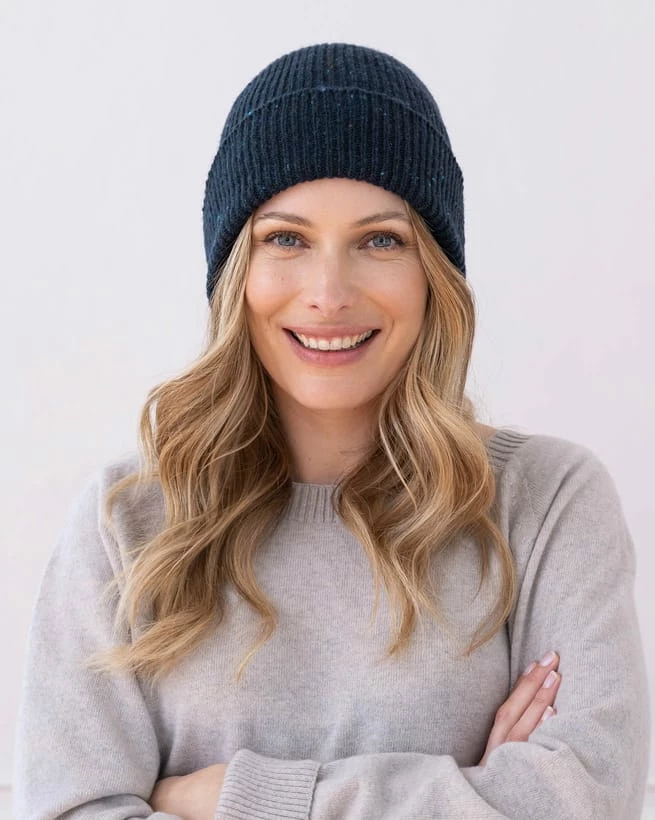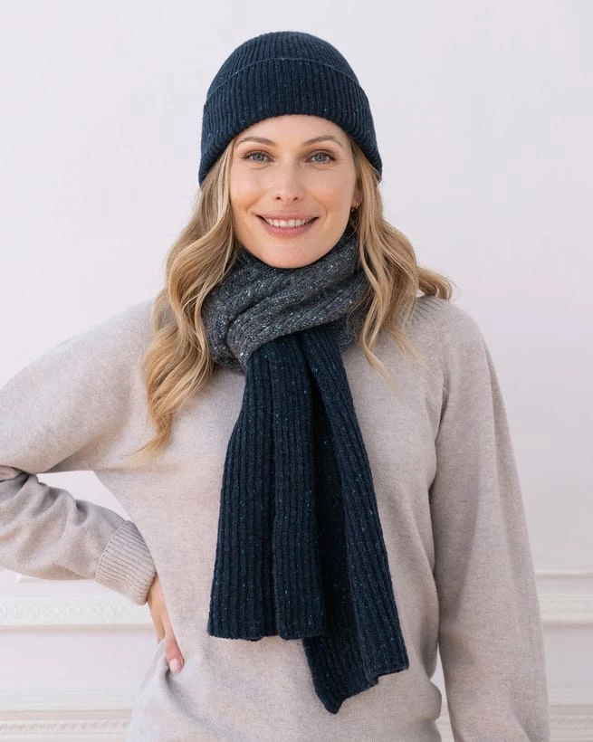 The combination of our Donegal wool and a chunky rib stitch is a match made in winter-accessory heaven! The simple structure really highlights the yarn’s characterful flecks and pops of colour, but the overall effect is still understated enough that you can wear this beanie with anything and everything. Knitted in Britain, it’s finished with a turnback for extra cosiness.