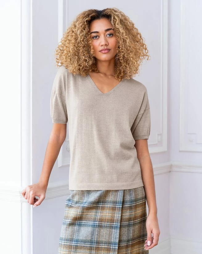 Featuring a V neckline and dropped shoulders, it’s designed with a double-layered hem to help it fall naturally when left untucked.