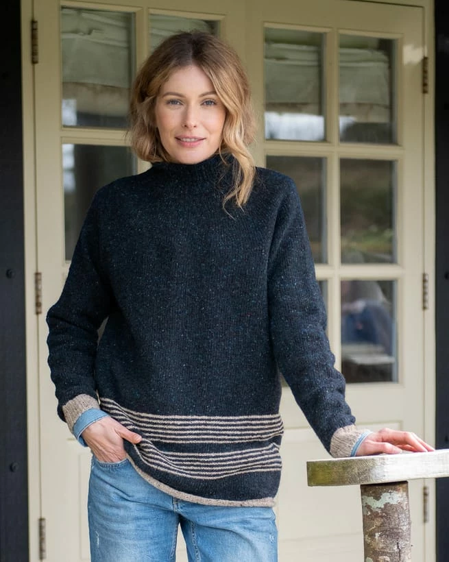 Cut to a generous shape for a cosy feel and easy layering, our funnel-neck sweater is crafted in genuine Donegal wool that’s been spun and dyed in Ireland for that authentic look. The yarns have been twisted to give a traditional nepped effect to the modern colour-blocking.