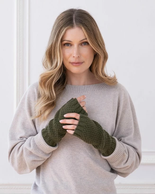 Crafted with a moss-stitched technique for a creative texture, this pair simply slides on to keep your hands and wrists warm while leaving fingers free for practicality.