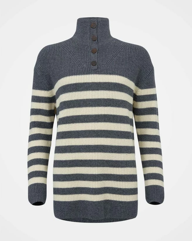 In a classic Breton stripe design, we’ve given this jumper a casual dropped shoulder and added deflected ribbing along the front yoke to give a flattering finish into the funnel neck collar. The all over ribbed stitch adds texture, and the Corozo buttons at the neckline can be worn buttoned up or down depending on preference, and the weather!