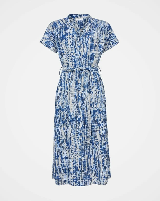 A lovely button through midi dress with side pockets, short sleeves and a notch neck with a stand collar. Details are added through gathering at the front and back yoke. The fabric blend has created a draped yet slightly structured appearance, which hangs beautifully on the body. Adjust the fit to your desired preference using the self tie waist belt.