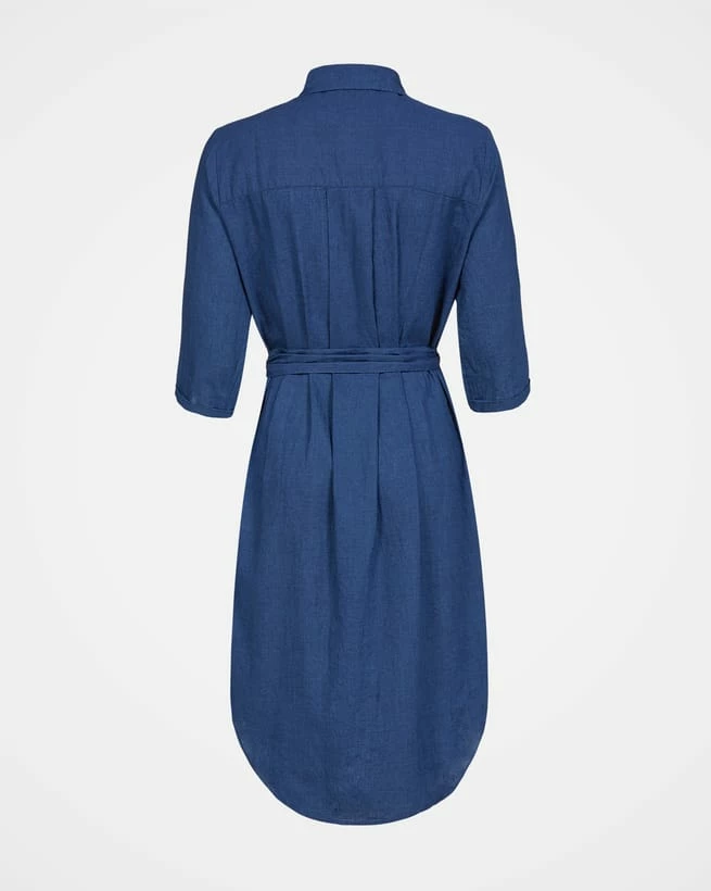 The perfect dress if you’re looking for light and breathable with a little more coverage. Washed to give it a beautiful, soft, tumbled look, this classic shirt dress is a flattering length. Featuring a curved hem, side pockets, half length, turn up cuff sleeves and collar detail. The fabric has a small check pattern throughout, creating texture. Use the self tie belt to style as you wish, either creating a fitted, cinched at the waist silhouette, or belt-less for a straight shirt dress style.