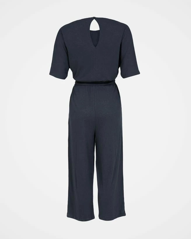 This beautiful jumpsuit has a relaxed, slouchy look that can be dressed up using the self-tie to create a more fitted silhouette. Made in our classic linen and organic cotton blend jersey, which features a beautiful textured slub to the fabric, it has an elasticated waist, cropped, wide legs, a crew neckline, side pockets and button and keyhole detail at the back of the neck.