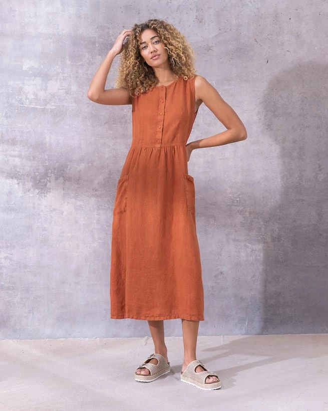 A dress that you’ll reach for over and over again. This airy midi dress is perfect for spring and summer days when the sun is shining. Created from light and breathable linen, it features pockets on the hips, a button through bodice, gathering at the waist seam and a skimming silhouette.