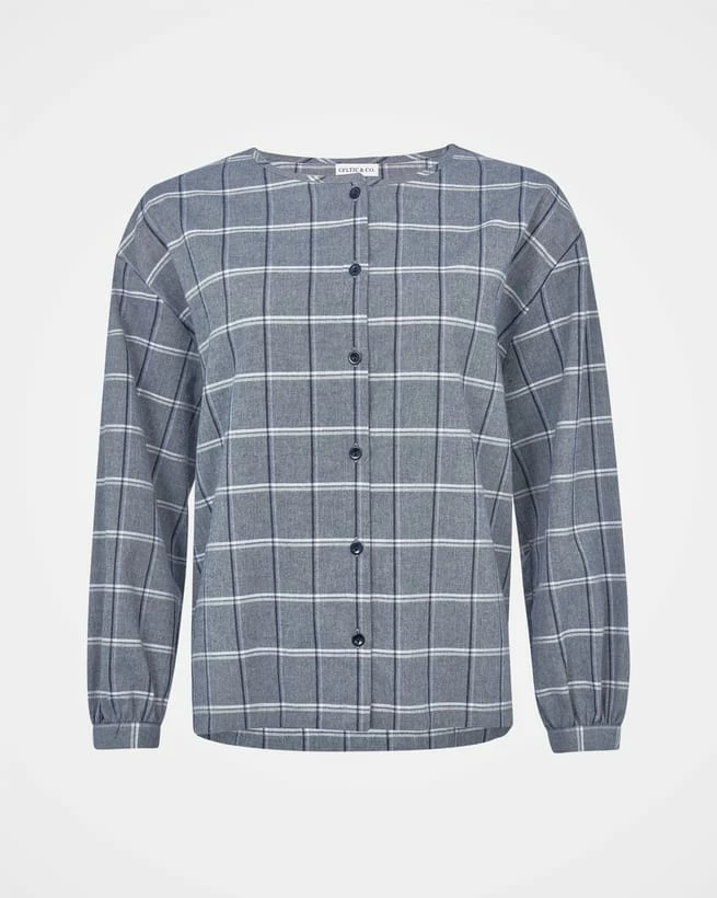 With a soft, flannel finish and in a light windowpane check fabric, this easy-to-wear shirt is collarless and has a pretty, wide crew neckline. Finished in a button-through style with natural Corozo buttons, it has a drop shoulder shape. The long sleeves have a soft fullness through gathering into the seam, and the cuffs are narrow and buttoned. Wear with denim and white trainers for casual comfort.