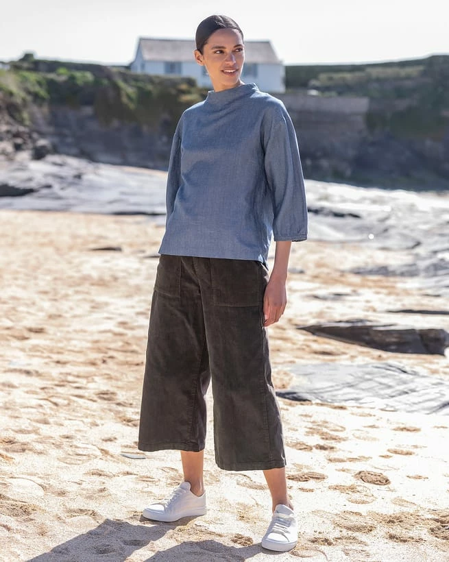 Hardwearing, warm and soft, we’ve created this wide legged, corduroy trousers to be ideal for autumn and winter. Slightly cropped in length, we’ve opted for an elastic insert into the back waistband for ease of fit, plus utility style patch pockets on the front hip and back. Details include a metal fly fastening at the front plus a large Corozo button. Pair with any of our woven, jersey on knit tops, a pretty blouse or a cosy jumper. A true staple piece, they look great with both trainers or boots.