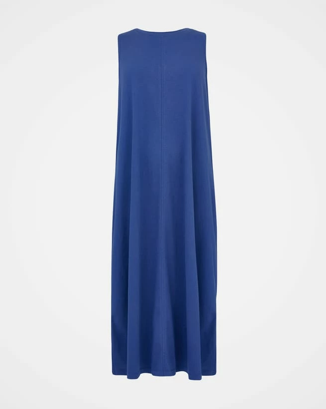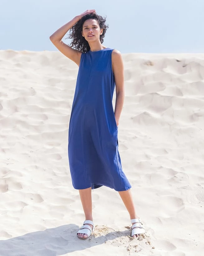 This sleeveless midi dress features side pockets, a back yoke seam and a centre back pleat to create a flattering fit that skims the body. The relaxed, soft fabric and effortless style of this dress makes it easy to style in many ways. Dress up with wedges and accessories for evenings or go for a more casual look with trainers or sandals for beach days.