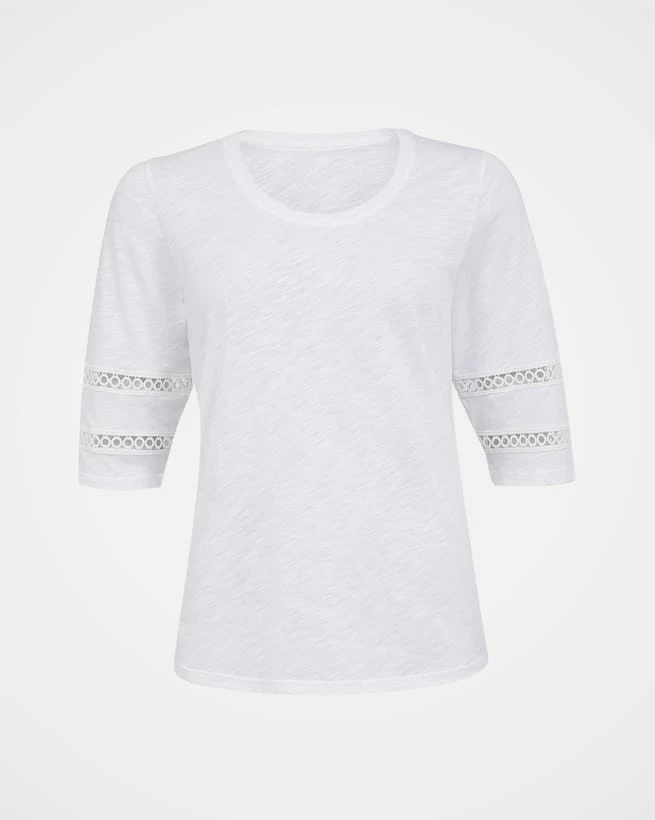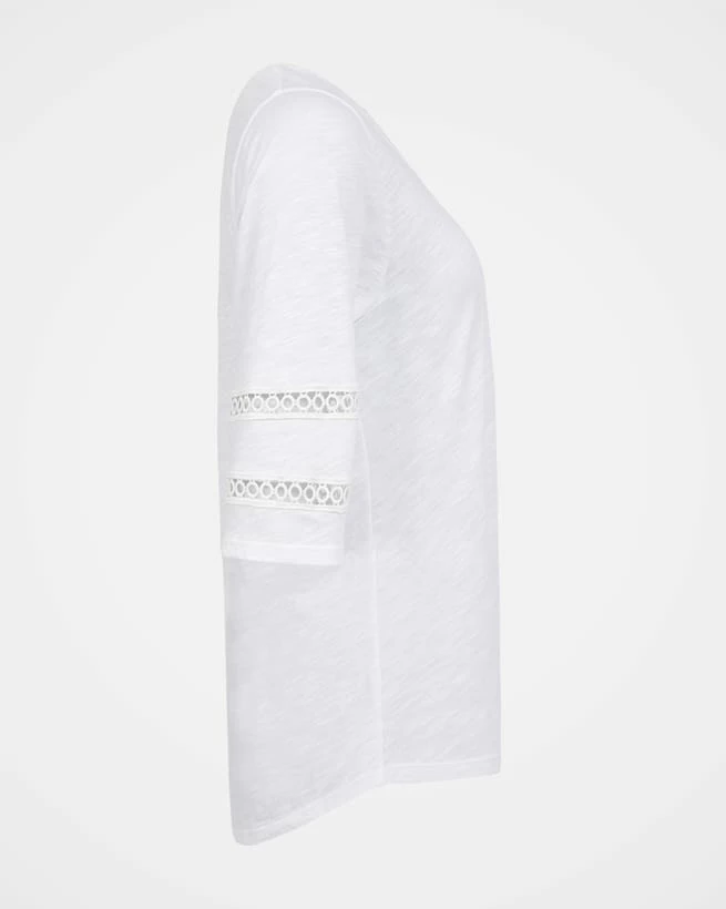 The slub jersey fabric adds some subtle surface texture to the top. Featuring a flattering scoop neckline, half length sleeves and body skimming fit. The loop lace trim inserts add interest to the sleeve.