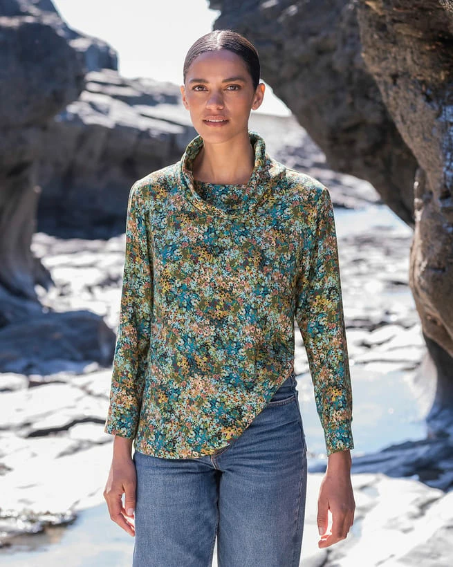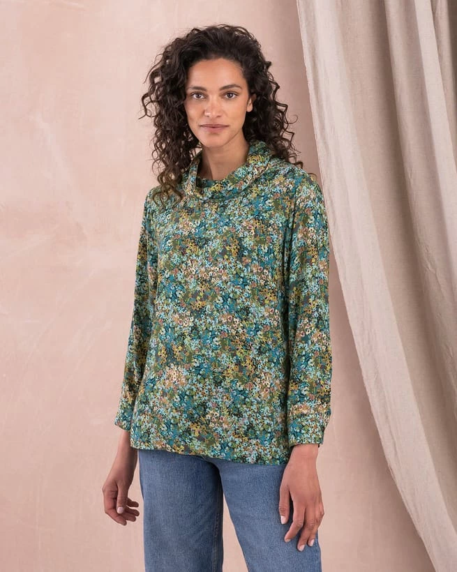 This beautiful woven blouse has a high, modest cowl neckline made with a double layer of fabric. Perfect for warmth in the cooler months, the long sleeves are finished with pretty shirt cuffs that fasten with natural Corozo buttons. We’ve added splits in the side seam for ease of fit.