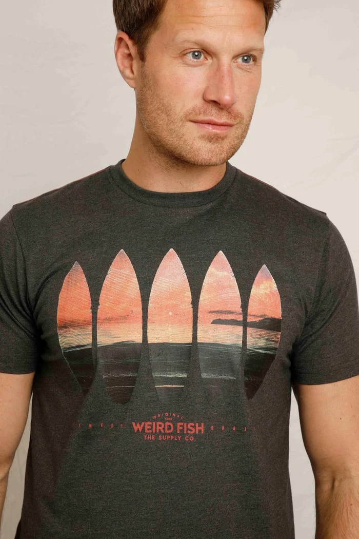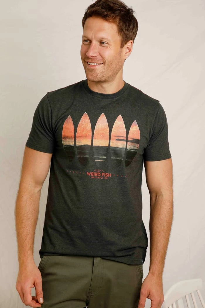 Surf’s up! Showcase your love for the sea with our surfboard and sunset print. This relaxed tee looks great paired with cargo shorts and flip flops.